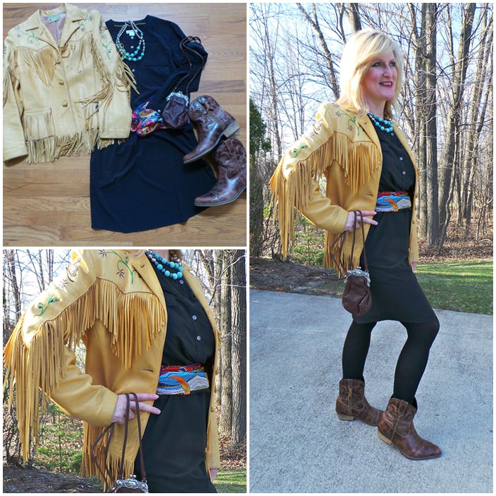 I paired the Florence Travel Dress with a silk scarf for a belt, a vintage fringe buckskin jacket, tights, mock western boots, a Brighton inspired crossover bag and a faux turquoise and silver necklace. Note how the dress is a perfect neutral against the wild accessories. This is s great example of how easy this dress is to dress down.
