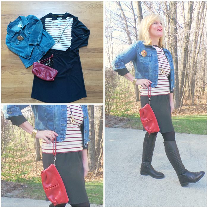 I styled the Orvis Florence this time as a skirt. Over it I popped a red nautical stripped mid-sleeved Orvis top that I spotted on sale. Can I just say “my favorite top in my closet for spring?” A blue jean cropped jacket, gold heart thread necklace, gold cuff, leather red bag, vintage pin, tights and quilted boots complete the ensemble. In Michigan, it’s still cold out but the sun is bright. Luckily, this Florence Travel dress has UPF 50 sun protection.