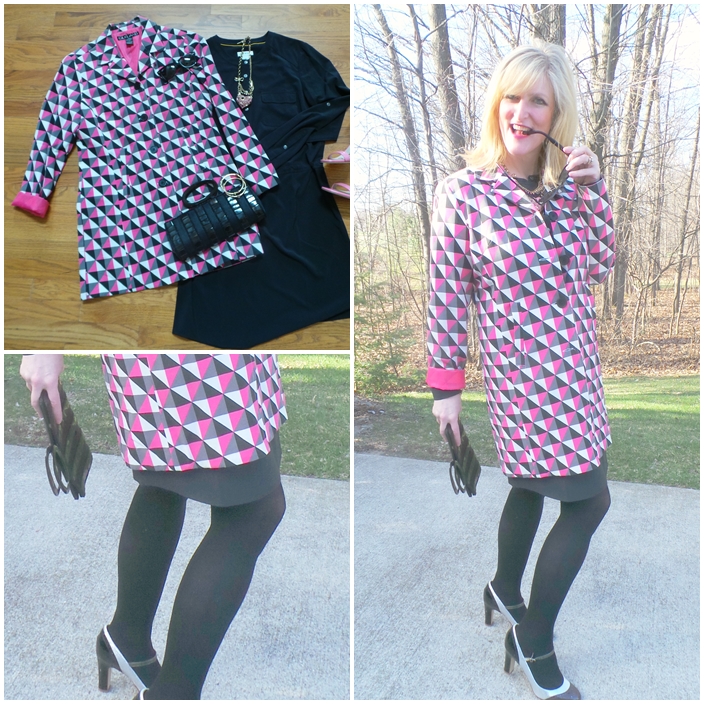 Styling the Orvis travel dress as a blouse was easy. Under this scuba leopard print skirt the dress is like a liner or slip. Can’t you see how well this dress will travel? A leather jacket, high pumps, tights, vintage purse and crazy necklace finishes off this look. The best part about traveling with this dress? It’s machine washable and wrinkle resistant.