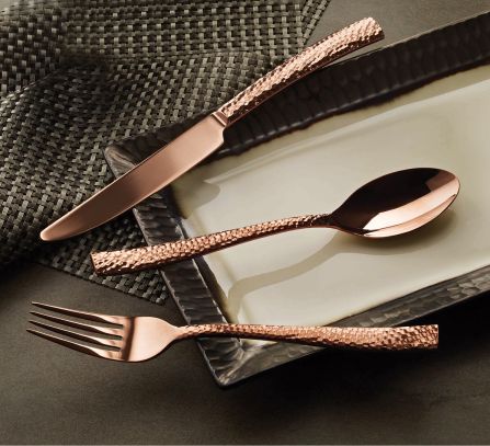 What makes the Paris Hammered flatware so special? Well for one, it’s 18/0 Titanium-plated stainless steel and a lustrous copper color. This dinnerware is so durable that it has a 25 year warranty and if you’ve ever had flatware that breaks or stains or tarnishes, you know how important that is.