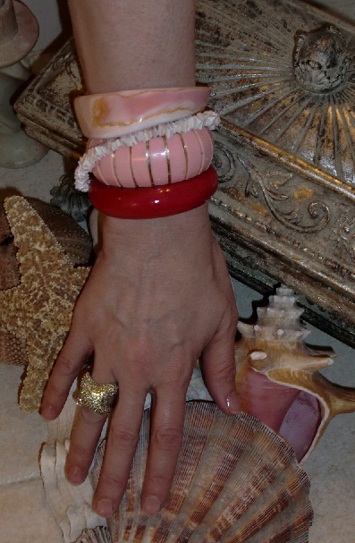 The Chief Blonde is wearing (Top to bottom)- Real Conch Bangle, Surfer shell bracelet, Vintage Plastic Pink and Gold Elasticized cuff, and Bamboo cuff  c/o Mango Tree $20  (seen here and here),  Ring c/o Serena Williams Signature Ring Collection. $65 (seen here and here)