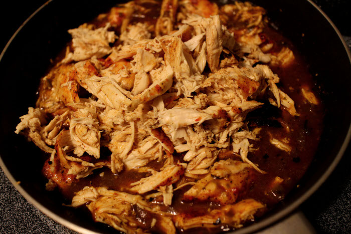 - Fill tortilla with a light amount of lettuce and fresh cilantro leafs. Top with Cilantro Lime Shredded Chicken from skillet.