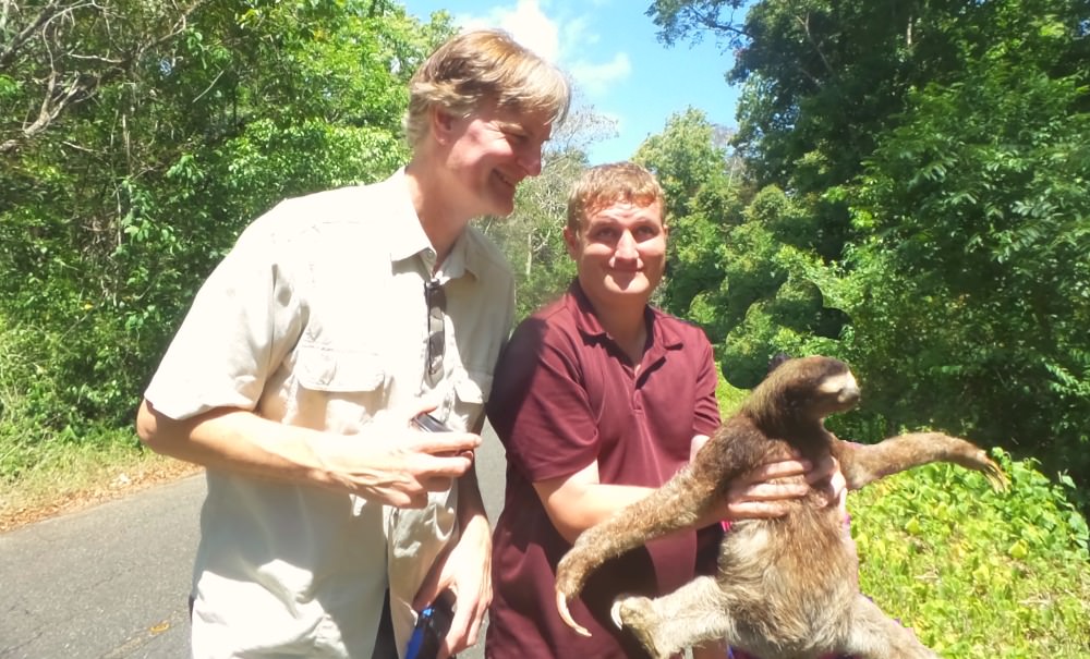 Walt hung out with a sloth that was crossing the road in the rainforest.
