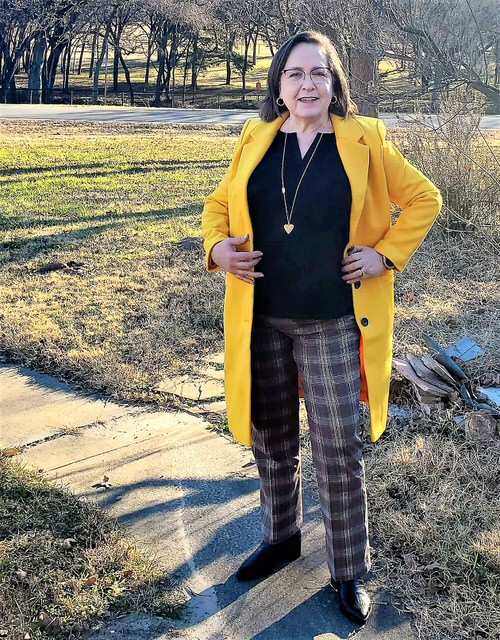 Here’s my friend Anna in a yellow version of the overcoat! See what a great style this is?