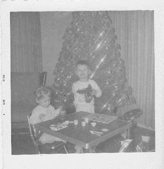 When I was little, my mom and dad bought me my first “Big Girl” teacup. It was pink, white and cream–so girly! My mom saved it for me over the years, and she finally gave it to me about 10 years ago! When I was small, I enjoyed using the teacup when my grandparents would come over and share tea with us. Invariably, my grandmother would bring her special Heirloom IceBox Oatmeal Cookie for dunking in the tea. Is there anything like the wonderful soothing blend of tea and cookies? I remember sitting there with my mom, my brother and my grandma and grandpa, while Grandma told stories from the past. I felt so grown-up having my own china teacup and sipping tea along with them. One year for Christmas, my brother and I received a child size “card table”, with it I received a blue tea set. I still remember how much I played with that set, pretending to have tea parties, asking people what they wanted in their tea, and fake drinking my own. When I could get my brother to put down his gun, he would even play along. The Chief Blonde and her brother..Christmas Tea Party