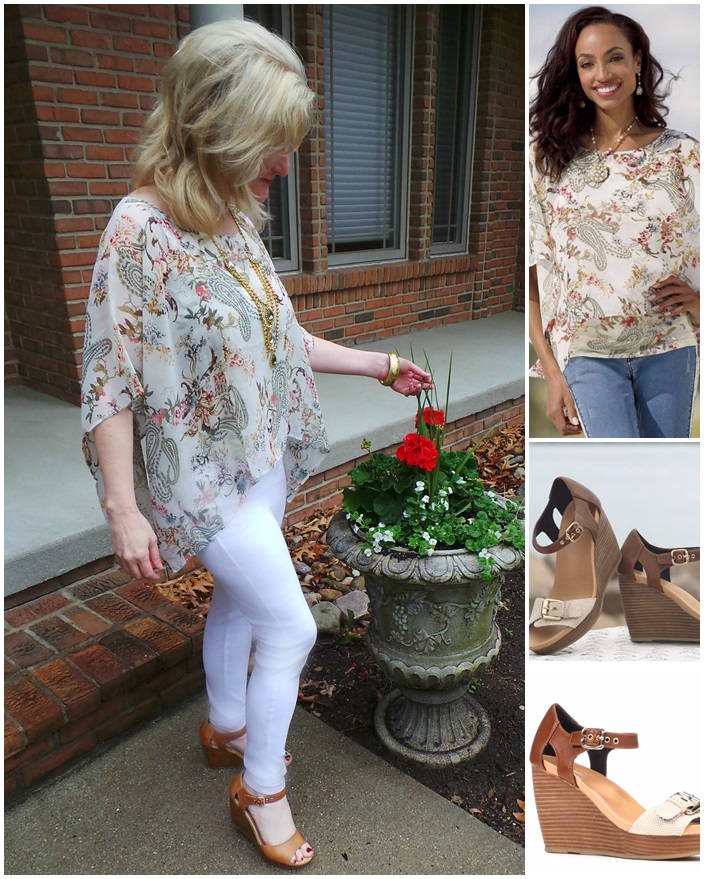 The Chief Blonde is wearing the Molton Wedge by Dr. Scholl’s (Monroe and Main $100), Romance in the Air top (Monroe and Main $50, Sale $11), gold statement necklace from Monroe and Main (similar), white leggings from Sam’s Club. and High Waisted shaper briefs (Monroe and Main $29.95)