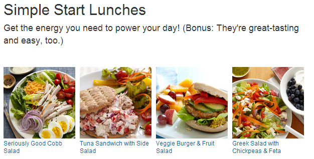 Basically, the the way Weight Watchers Simple Start Choose works (as I understand it) is that I choose meals and snacks from the list — and eat them! It’s kind of no-brainer really. For Lunch, I just click on the “Lunch” meals tab, and then it shows me 15-20 meals complete with ingredients, cooking instructions, and substitutions to change up the recipe. They even include the Weight Watchers points but in the Simple Start program, you don’t have to pay attention to the points…you just pick a meal and eat it! BAHM! Isn’t that SIMPLE?
