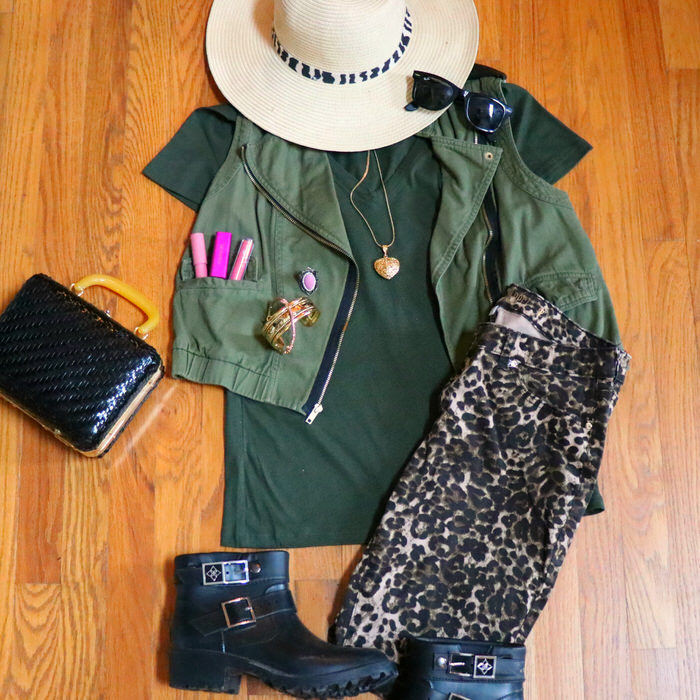 Daily Ritual t-shirt from Amazon | Black straw bag vintage (similar) | Ray-Ban Sunglasses | Straw hat (similar) | Green Vest (Similar) | Black Moto Rain Boots |