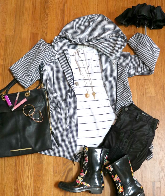 Striped Daily Ritual T-Shirt from Amazon | Roma Rain Boots | Blank Denim NYC faux leather pants (similar) | Gingham Rain Coat | Steve Madden Bag