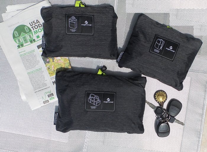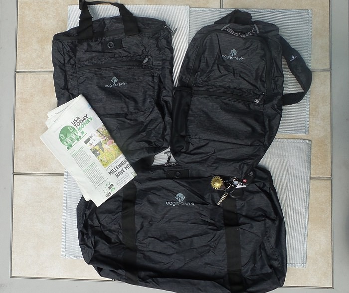 Eagle Creek Tote/Pack, Daypack and Duffel in their expanded state. Note how small the keys and paper are to the expanded Eagle Creek Packables.