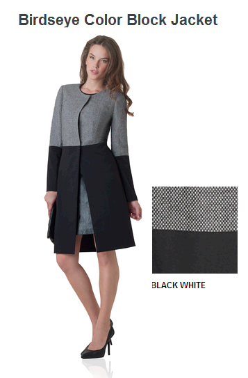 Classic birdseye tweed fused with blocks of black Ponte fabric make up this stylish, lightweight coat with a jewel neckline. ($149, sale $74)