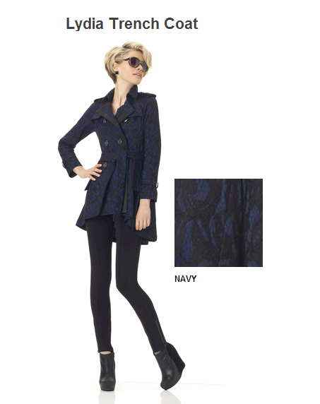 Lydia Trench Coat : Double-breasted trench coat is transformed with elegant stretch bonded lace and a high-low hemline (Reg. $214, sale $159)