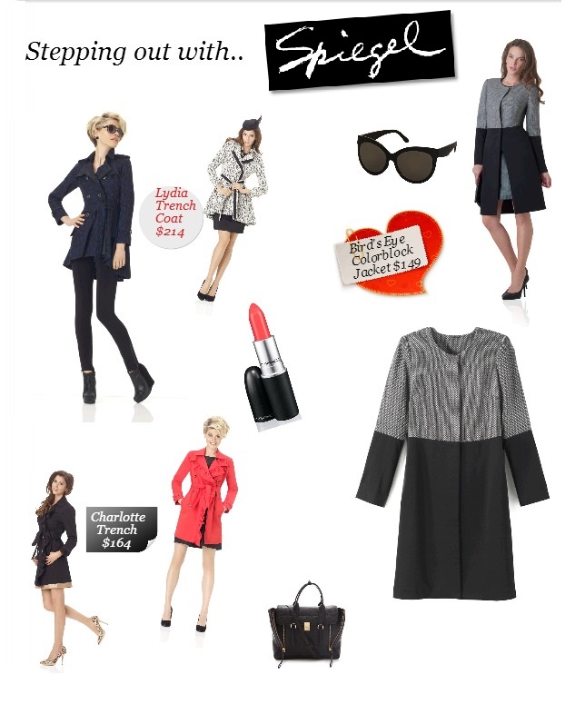 Gorgeous outerwear from Spiegel.com. Clockwise: Bird’s eye Colorblock Jacket, Charlotte Trench, Lydia Trench Coat