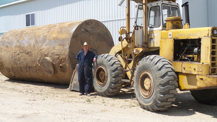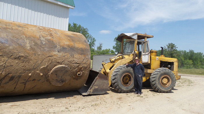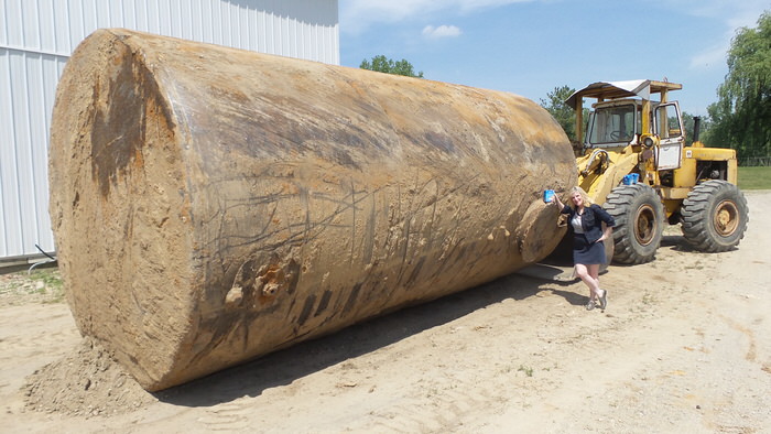 That gasoline tank above was in the hill. It weighs 6 tons, is 10 ft X 20 ft and has a 10,000 gallons capacity. His neighbor, an excavator, helped my dad to get the tank loosened with a piece of his excavating equipment, but they couldn’t get it all the way out with that small piece of equipment.