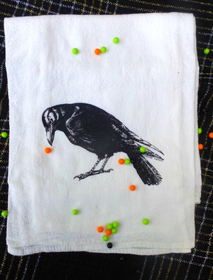 Raven Tea Towel — How CUTE is this flower sack towel? Perfect for your spooky dishes. I hung mine in my bathroom to scare my guests! I mean, have you EVER seen a scarier movie than the birds? 100% cotton to keep the lint away. Find at CounterCoutureDesign on Esty. $13