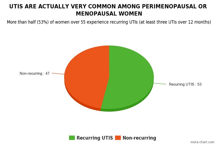Surprise! Just more menopause fun! Not only does menopause bring physical changes and symptoms like hot flashes, night sweats, mood swings and missed periods, but UTIs (Urinary Tract Infections) are quite common. In fact, as the pie chart above notes: more than half (53%) of women over 55 experience recurring UTIs (at least three UTIs over 12 months)